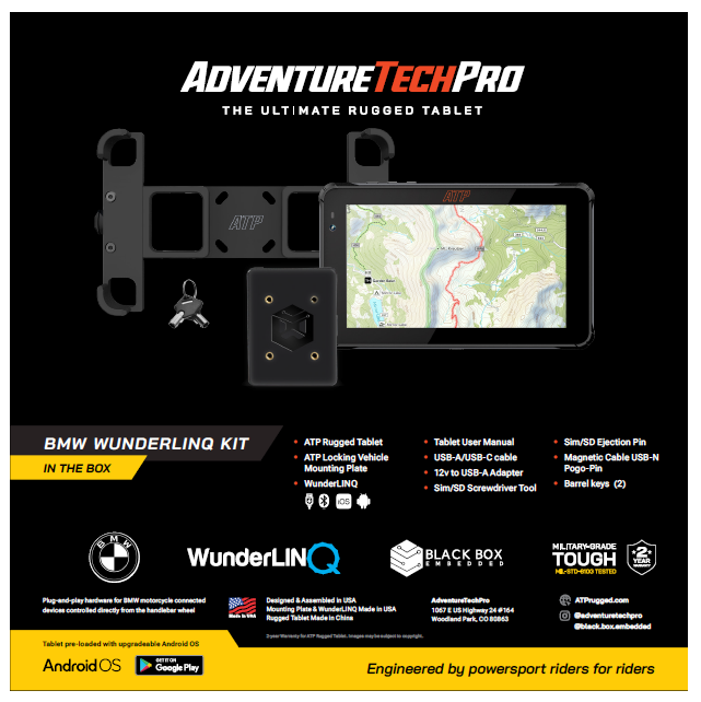 The WunderLINQ + AdventureTechPro Tablet Kit delivers professional-grade navigation and connectivity for demanding environments. This integrated system combines WunderLINQ's proven command interface with AdventureTechPro's rugged tablet platform, engineered to withstand extreme conditions while maintaining reliable performance. Ideal for field operations, remote expeditions, and mobile professionals who require seamless data access and real-time navigation without compromise. Built for durability and precision in challenging terrain.